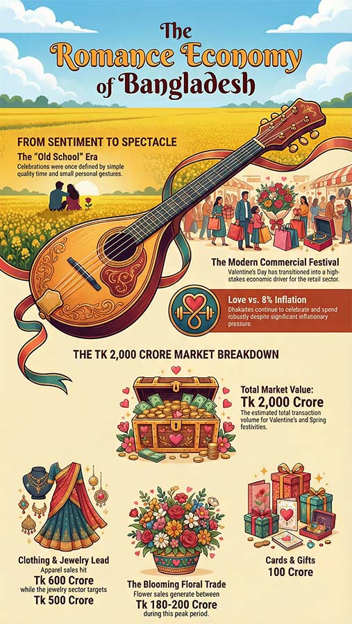 In the past, Valentine’s Day was simpler. It was mostly about spending quality time and talking. Now, it is a “romance economy” worth over Tk 2,000 crore. (click on 2000 Cr for a fact check.)