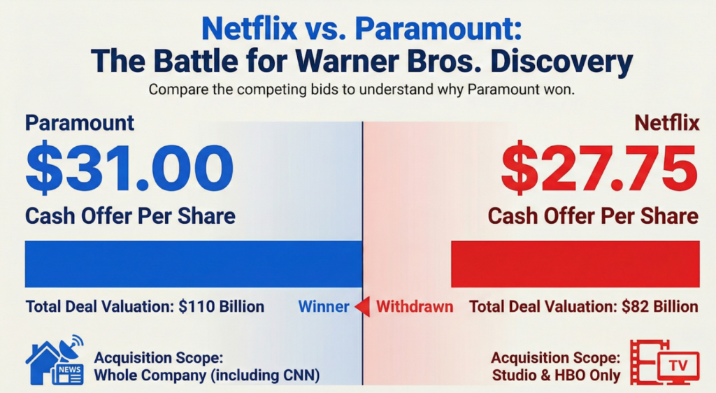 Netflix decided to walk away because the bidding war became too expensive. Warner Bros. Discovery (WBD) officially named Paramount’s latest bid a “superior proposal”. Paramount increased its offer to $31 per share in cash, while Netflix’s offer stayed at $27.75 per share. Netflix executives, Ted Sarandos and Greg Peters, explained that they must remain “disciplined” with their money. They stated that at the new higher price, the deal was “no longer financially attractive”.